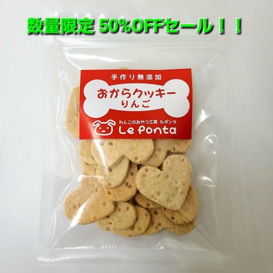 当店人気商品「おからクッキー」の りんご味。 数量限定で、半額にて販売させていただきます! 通常は内容量40gで販売しておりますが、こちらは35gの商品となります。 定価420円→210円  賞味期限は約1年あります。購入数量に制限はありませんので、ぜひこの機会にお安くご購入ください^^♪ ※原材料などの詳細は、通常のおからクッキーりんごのページをご覧ください。